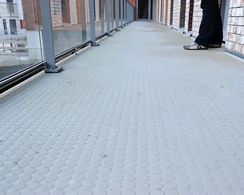 Die raue Oberfläche sorgt für eine bessere Griffigkeit bei Wasserglätte. über die Vertiefung zwischen den Noppen (rund 29 mm) wird das Wasser schnell abgeleitet. Durch die raue Struktur und die Wasserableitung wird dem Aquaplaning effektiv vorgebeugt. Die runde, schöne Ausstrahlung der Struktur GIAN 7 Noppen gibt dem Beton einen weichen Touch und sie lässt sich dadurch in fasst jedem Gebäude anwenden. |